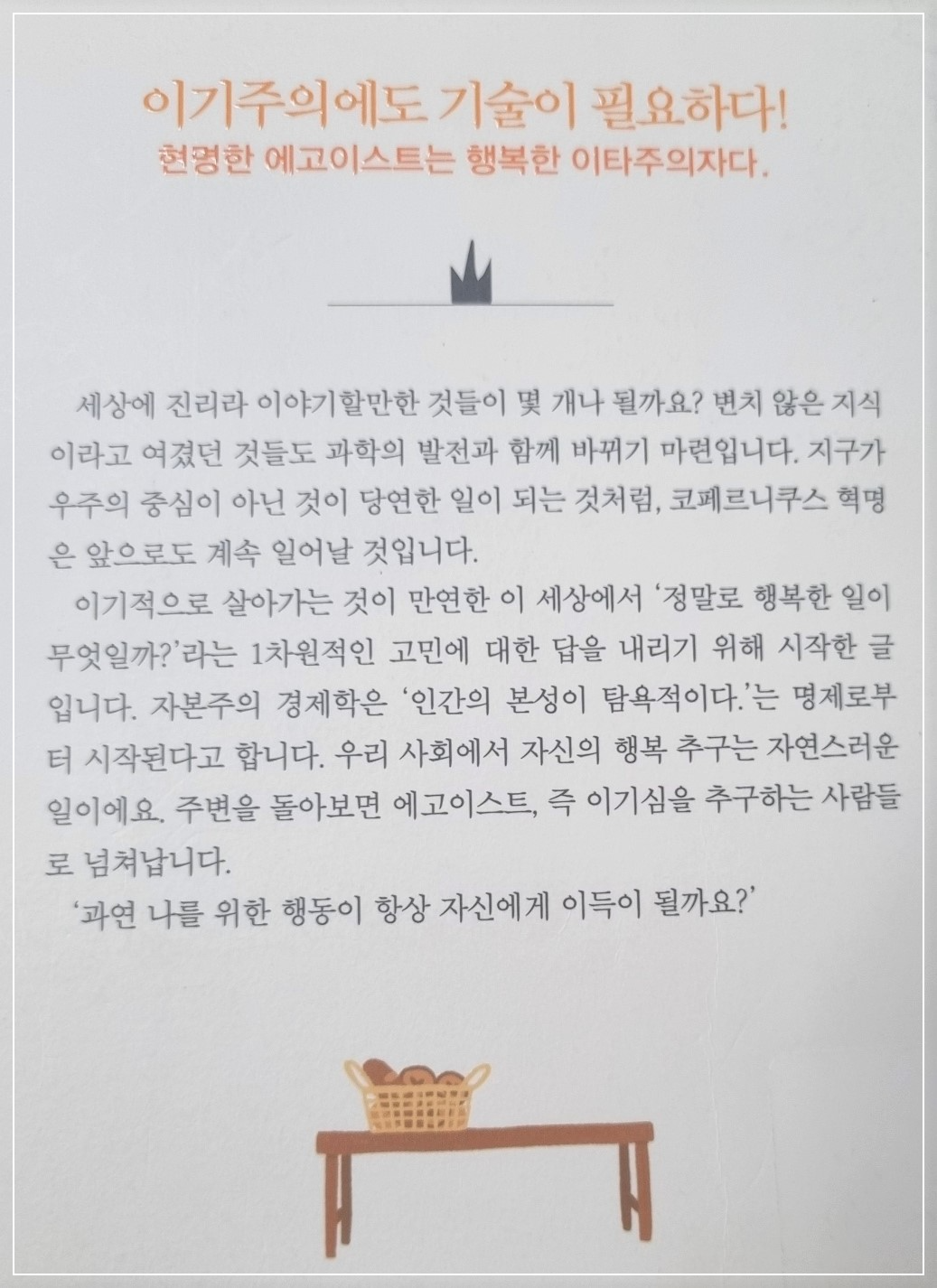 "나는 이기적으로 살기로 했다" 이 책은 제목만으로도 위안을 주는 것 같다. 무엇이든 내 마음대로 해도 될 것 같고 그렇게 해도 충분히 괜찮다고 얘기해 주는 것 같았다. 이 책은 이기적으로 살아도 더 행복하게 살게 되는 이야기들을 다루고 있다. '진정 행복한 일이 무엇일까? 책에서 말하듯 나는 나무가 아닌 숲을 볼 줄 아는 현명한 이기주의자가 되고 싶다.