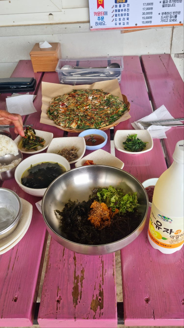 톳멍게비빔밥, 해물부추전 그리고 직접생산한 특산물인 유자막걸리를 마셔보았습니다.