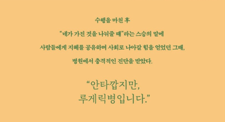 근위축성측색경화증 일명 루게릭병이다. 이 병의 수명은 최대 5년이란다. 의사는 그에게 1년에서 5년 사이로 본다고 했고 이 글을 쓰는 현재 1년 하고도 9개월이 흘렀다. 그는 삶이 동시에 두 가지 국면으로 흘러가는 것을 깨달았다. 검사 결과는 절망과 충격 그 자체였다. 그와 동시에 너무도 담담하게 새로운 현실을 조심스럽게 열린 눈으로 마주했다. 저항하지도 않았고 이상할 정도로 딱히 낯설지 않았다. 늘 깨어 있으면서 현실에 절대로 맞서지 않는 부분, 바로 알아차림이었다.