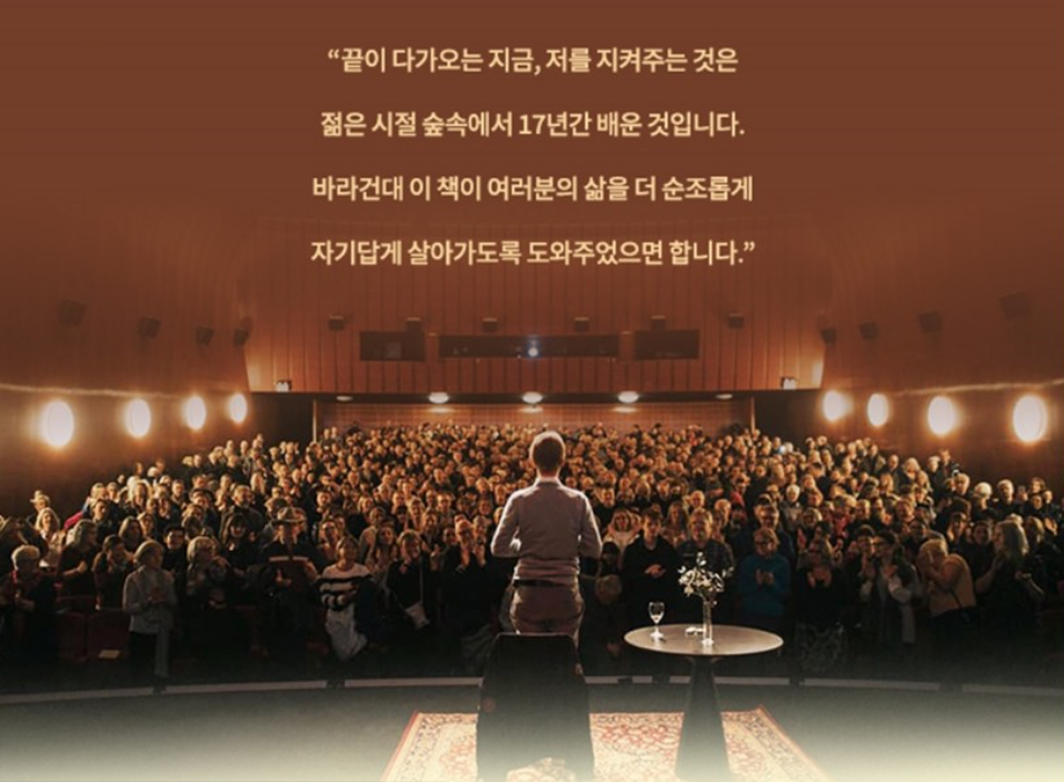 사람들은 그에게 말한다. "정말 많은 배움과 깨달음을 얻으셨겠군요!" 딱히 시공을 초월하는 지혜의 보따리를 이고 다니는 건 아니다. 그는 점점 줄이고 삶을 위한 공간을 더 넓히고 있었다. 그랬더니 조금은 더 현명해지는 것 같기도 하다. 삶에 폭풍우가 몰아칠 때 그는 단지 그 순간을 그대로 알아차리려 할 뿐이었다. 최대한 내려놓는다. 대신 기꺼이 받아들이고 어떻게든 헤쳐 나가려 애쓴다.