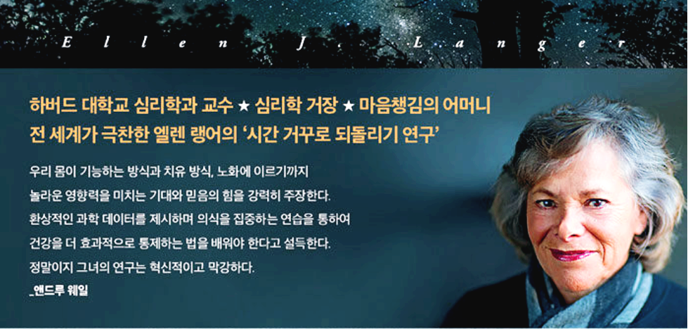 이 책의 저자 엘렌 랭어는 하버드 대학 교수다. 1979년에 75~80세 노인들을 대상으로 '시계 거꾸로 돌리기 연구'를 실시했고 이 연구를 통해 노화와 인간의 한계, 고정관념에 대한 충격적인 반전을 제시하며 심리학계의 일약스타로 떠올렀다. 노화를 바라보는 사람들의 태도와 가치관에 인식의 전환을 불러일으켰다.