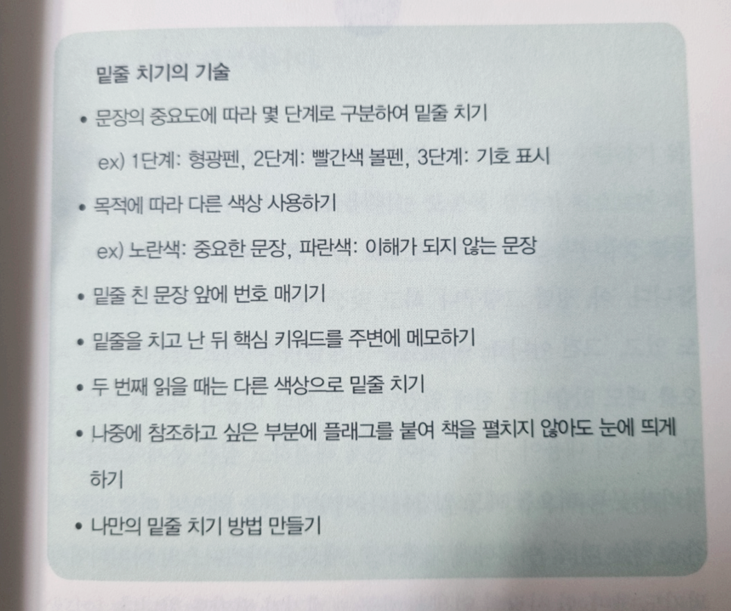 한눈에 파악할 수 있게 단계별 밑줄 치기를 해보자. 자신의 스타일에 맞춰 밑줄 색상에 의미를 부여해 보기도 하고 중요도나 목적에 따라 색상을 달리해 보자. 문장 앞에 번호를 써주는 것도 좋다. 나중에 자료로 정리할 때 몇 개의 항목으로 정리하면 될지 알 수 있어 편리하다.