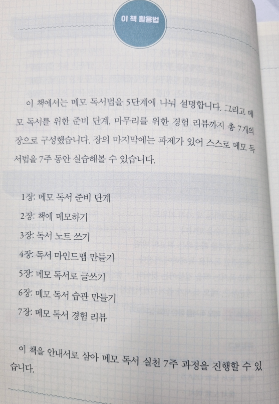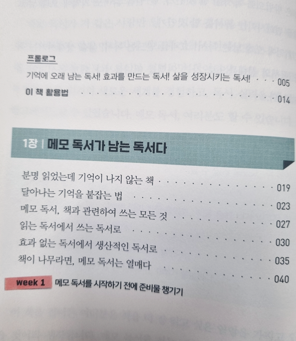 메모 독서 실천 7주 과정으로 진행된다. 1장을 일주일 기준으로 차근차근 쫓아가보자.