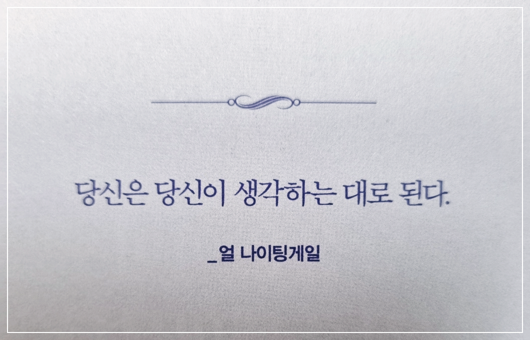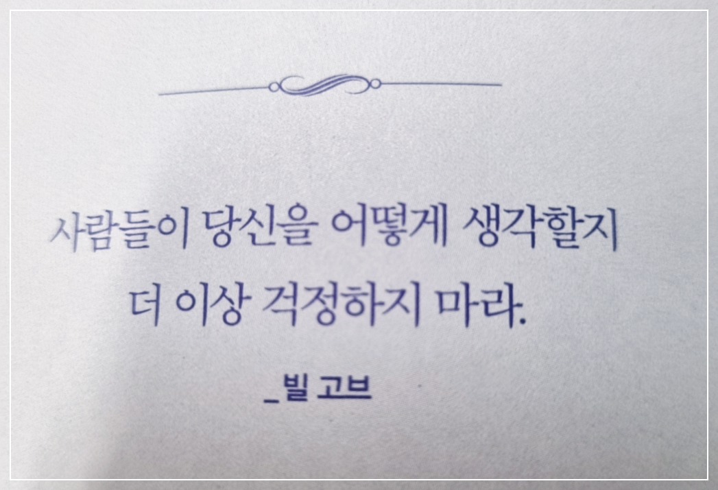 내가 나 자신을 어떻게 생각하는지에 집중하면 모든 일이 술술 풀린다. 다른 사람들이 자기를 어떻게 생각하는지에 대한 걱정은 대부분 인생의 초반기에 시작된다. 주변 사람들이 어떤 생각을 하든 결코 아무런 영향을 미치지 않는다. 대부분 사람이 남들이 자신을 어떻게 생각할지 걱정한다. 그래서는 안된다. 내가 나를 어떻게 생각하는지에 신경 써야 한다. 지금 내가 어디에 서 있는지 알아야 한다. 또 어디로 가고 있는지도 알아야 한다.