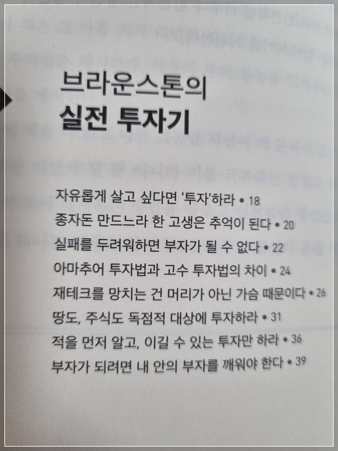 브라운스톤이 투자의 경험으로 느낀 가장 큰 깨달음은 무엇이었을까? 가장 강한 적은 보이지 않는다. 그 적은 바로 내 마음속에 있다는 것이었다. 부자가 되지 못하도록 하는 장해물이 바로 내 마음이라는 걸 깨달은 것이다. 부자가 되려면 내 안에 있는 부자를 깨워야 한다.