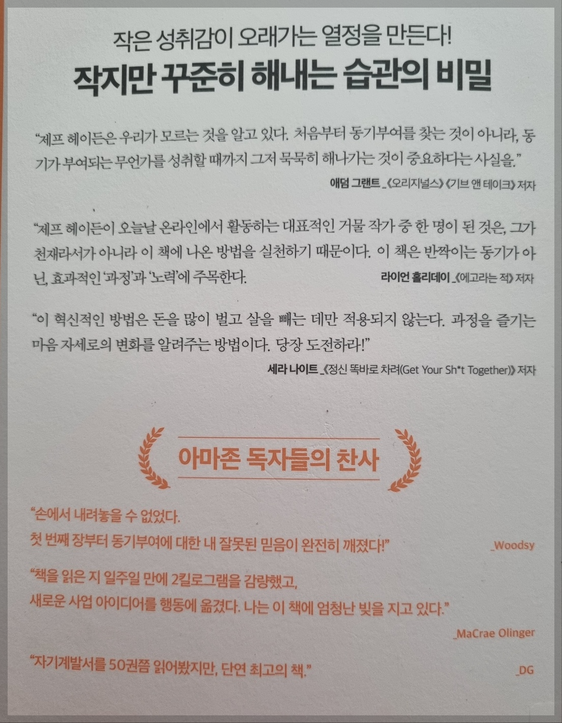 성공한 사람들의 대부분은 유리하지 않은 상황에서 출발했다. 바닥에서 시작하면 작은 성공을 즐길 기회가 더 많아진다. 그 기회를 위한 동기부여는 어떻게 생겨날까? 동기를 부여하는 방법은 한 가지뿐이다. 바로 '성공'이다. 인생을 바꿀 만큼 눈에 보이는 그런 성공이 아니다. 계속 동기를 유지하면서 포기하지 않고 목표를 이루려면 작은 성공을 정기적으로 맛봐야 한다. 동기부여는 작은 성공에 따르는 기쁨에서 자동으로 얻어진다. 성공은 과정인 것이다. 뭔가를 계속 바라고 전략을 세우는 것보다 그냥 성실하게 계속해나가는 것이 중요하다. 성공한 사람은 본인이 성공한 것을 예상하지 못했다. 어느 순간 자신의 성공을 느끼고 깜짝 놀란다. 그들은 그저 원하는 목표를 가지고 하루하루 성실하게 하는 데만 집중했을 뿐이었다. 올바른 일을 지속적으로 하다 보면 성공은 예측 가능하다. 필연적으로 된다. 너무 집착할 필요가 없다는 말이다.