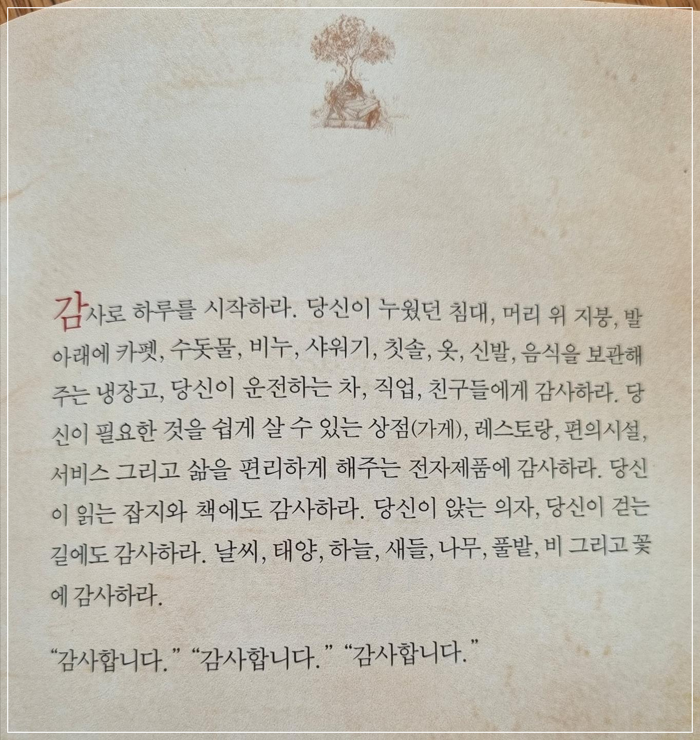 감사는 자신의 삶을 변화시키는 가장 강력한 방법 중 하나다. 누구나 쉽게 실천할 수 있다. 진심으로 감사하게 된다면 당신이 하는 모든 행동을 자석처럼 끌어당길 것이다. 감사한 마음 없이는 아무것도 바뀔 수 없다. 감사하는 마음으로도 당신의 삶에 크고 작은 변화들이 있을 것이다. 변화는 당신에게 달린 것이고 우주는그것을 끌어당길 것이다.