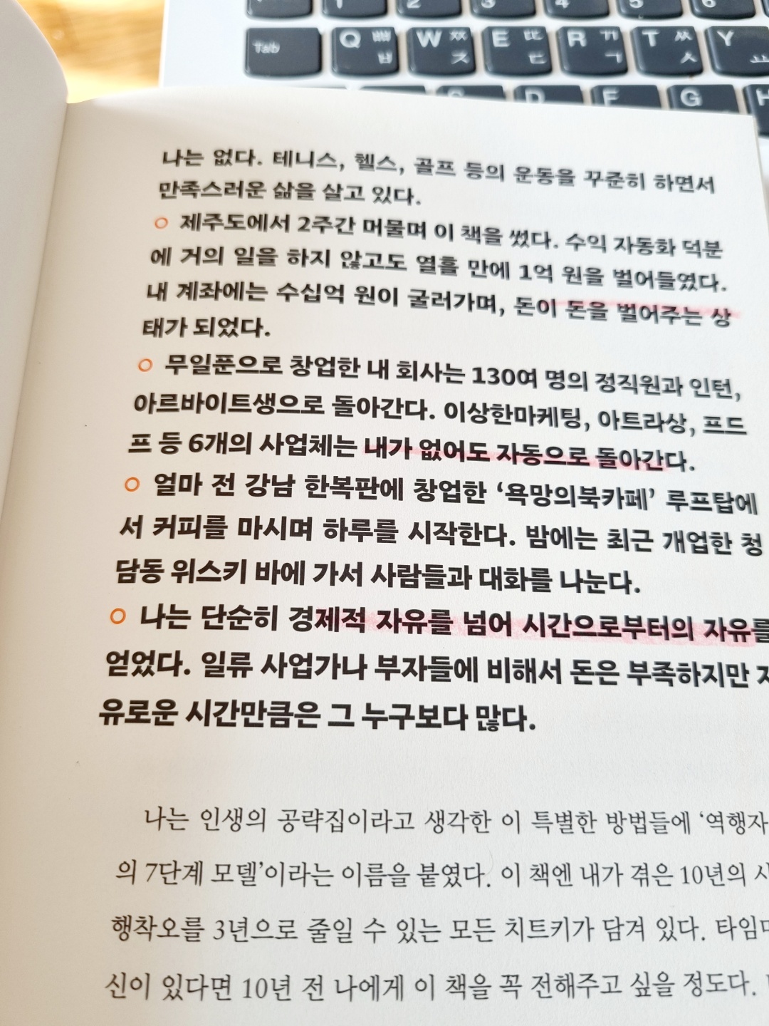 6단계 경제적 자유를 얻는 구체적 루트 : 이제 돈을 벌 단계다. 근본원리는 너무 간단하다. 첫째 상대를 편하게 해주기. 둘째 상대를 행복하게 해주기이다. 이 2가지야말로 사업과 투자의 시작이자 끝이다. 결국 돈버는 핵심은 문제해결력에 있는 것이다. 사람들의 감정을 알아채고 무엇에 불편함을 느끼고 어떤것에 행복감을 느끼는지 해결해 주는 것이다.