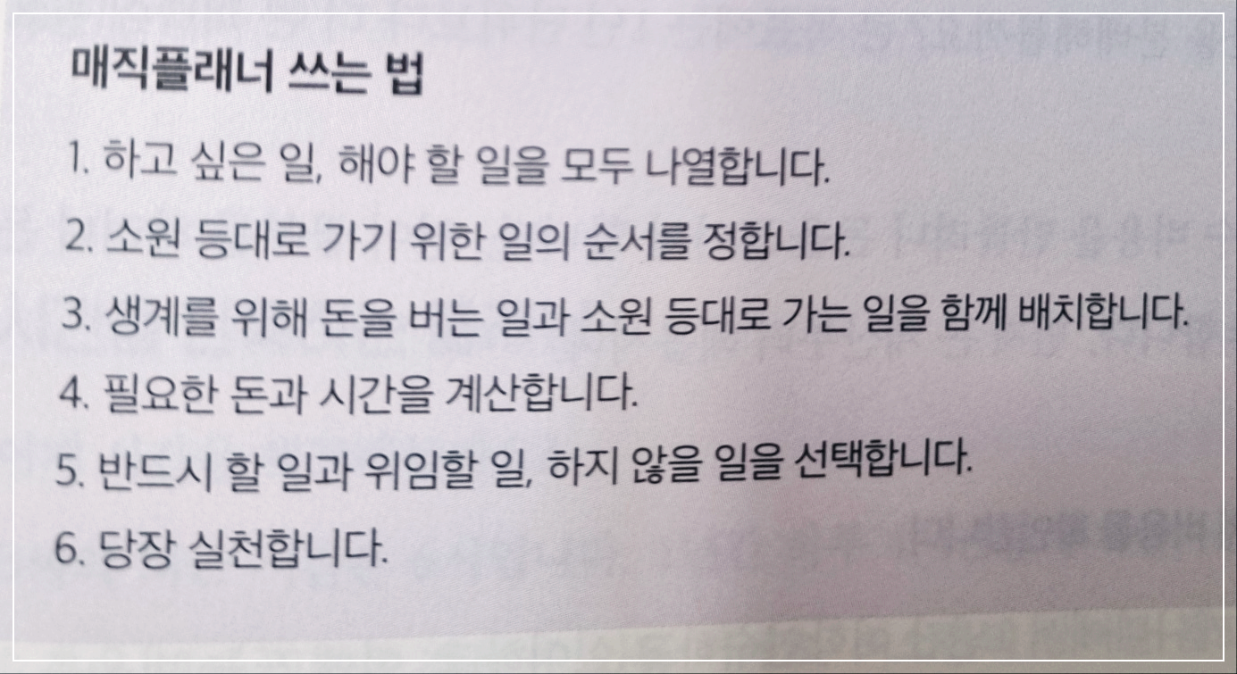 하고 싶은 일은 많고 시간은 부족할 때가 많다. 이럴 때는 일을 잠시 멈추고 매직플래너를 펼치자. 플래닝을 하기 위해 쓴 시간보다 더 많은 시간을 만들어낼 수 있다.