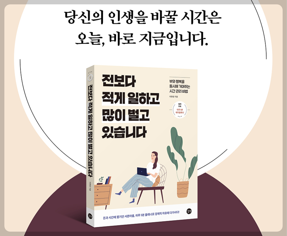어렸을 때부터 열심히 일해서 돈을 벌고, 그 돈을 모으면 천천히 부자가 될 수 있다고 배웠습니다. 그러나 쉬지 않고 일하고 늘 시간에 쫓겨 바쁘게 살면서도 제대로 되는 게 없었죠. 힘들게 일을 해도 늘 돈이 없었습니다. 그때는 알지 못했어요. 일 년이, 한 달이, 오늘 이 순간이 얼마나 소중한 시간인지, 그 순간이 쌓여서 미래의 제가 되리라는 것을... 너무 열심히 살아서 돈 벌 시간이 없었던 사실을 그때는 몰랐습니다. 돈을 버느라 내 시간을 모두 쓰는 사람은 더 가난해진다는 점을 말이죠.
