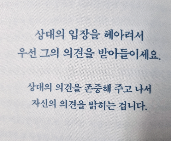 다른 사람의 이야기를 들을 때 나의 의견을 말하거나 조언하는 것도 상대를 위한 자상한 마음입니다. 다만 의견을 말하지 않는 것 또한 배려이자 섬세한 태도가 될 때도 있습니다.