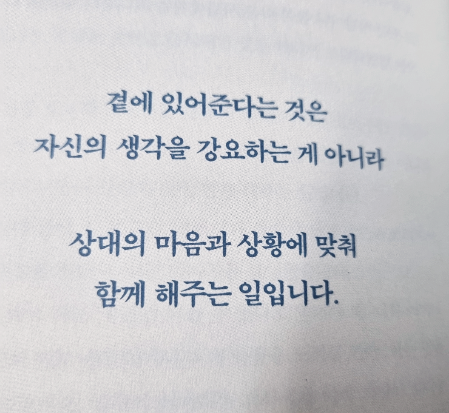 가장 중요한 포인트는 상대의 곁에 가까이 있어주는 것입니다. 곁에 있어준다는 것은 자신의 생각을 강요하는 게 아니라 상대의 마음과 상황에 맞춰 함께 해주는 일입니다.